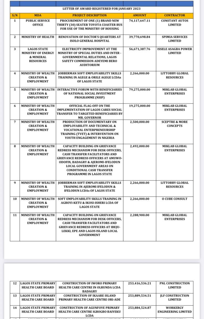 During investigation, this reporter came across a document published by the Lagos State Public Procurement Agency titled “Letter of Award Registered for January 2023”, stating that N253.9 million was budgeted for the construction of the Ikaare PHC.